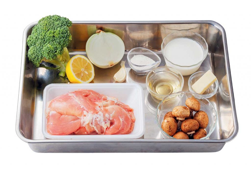 ❶玉ねぎはスライス、ブロッコリーは小房に分け、マッシュルームはさっと洗う。