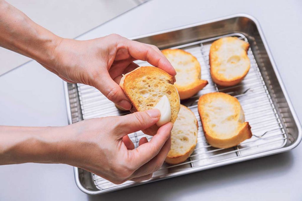 ❷フライパンにオリーブ油と①でみじん切りにしたにんにくを入れて弱火にかけ、香りが立ってきたらかきを加え、火が通ったらバゲットにのせる。