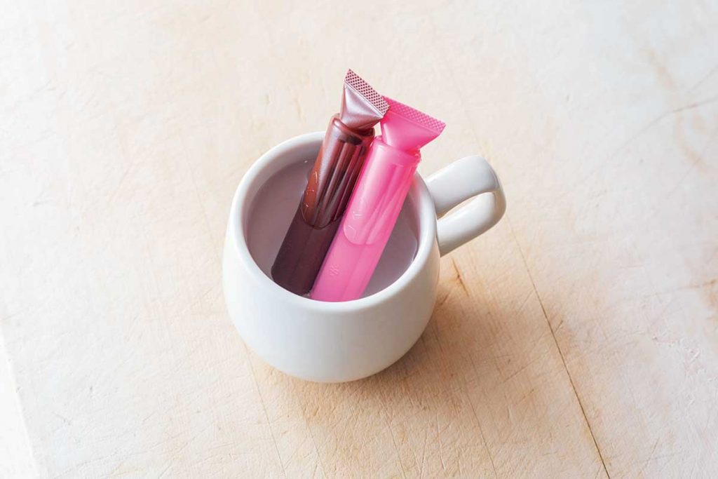 (※)チョコレートが硬いときは、お湯を張ったカップに入れて柔らかくします