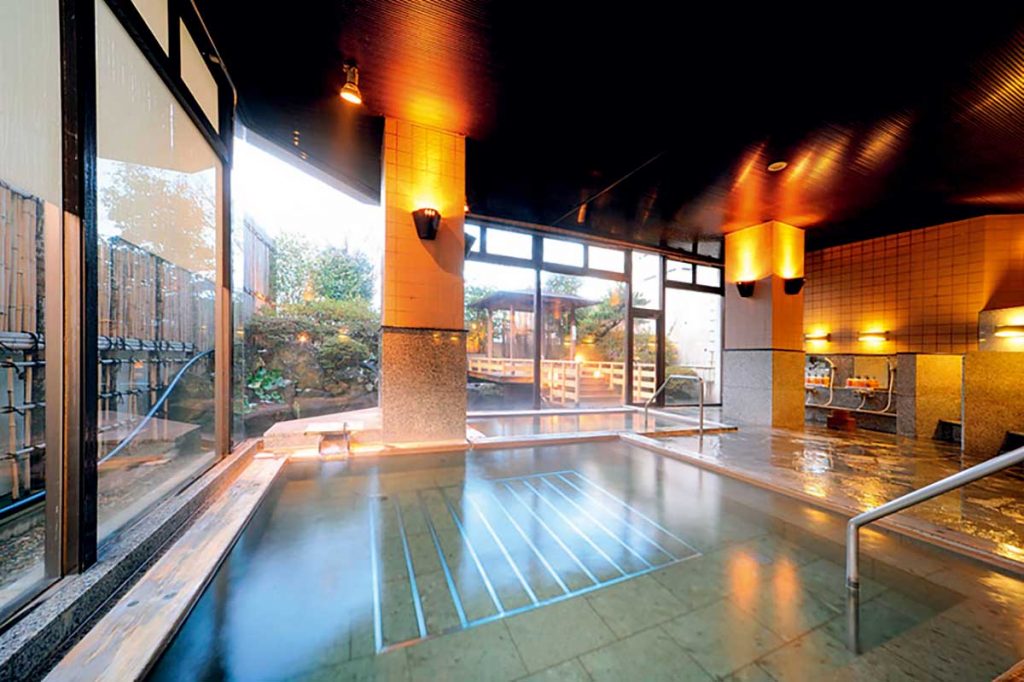 美しい中庭も見どころの大浴場のほか、檜造りと石造りの貸切家族風呂を用意しています