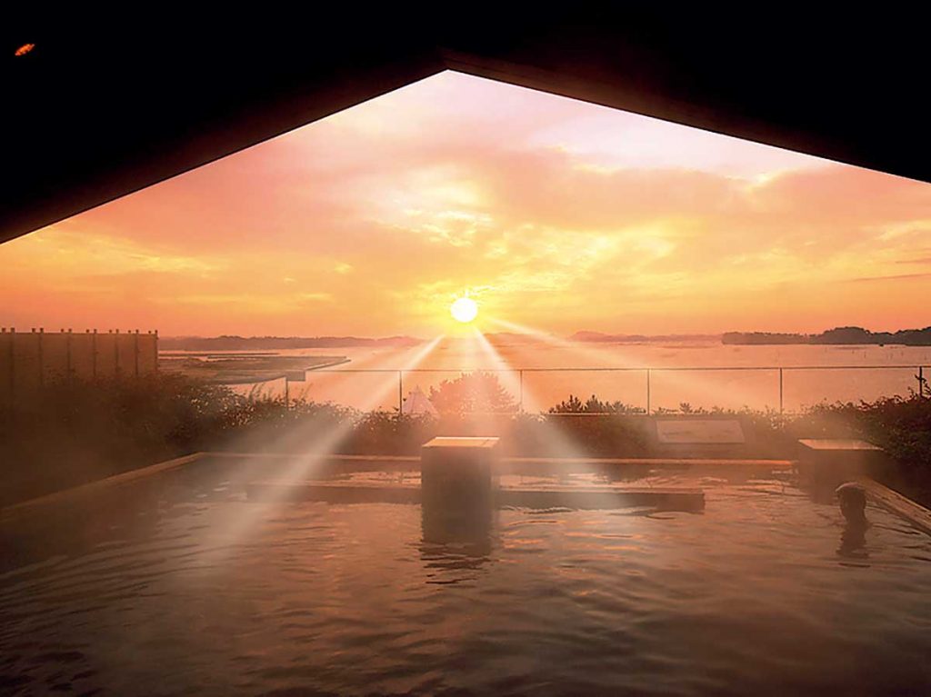 展望が絶景の最上階露天風呂に浸かって、松島湾の朝焼けや夕景、月夜を楽しむのが醍醐味です