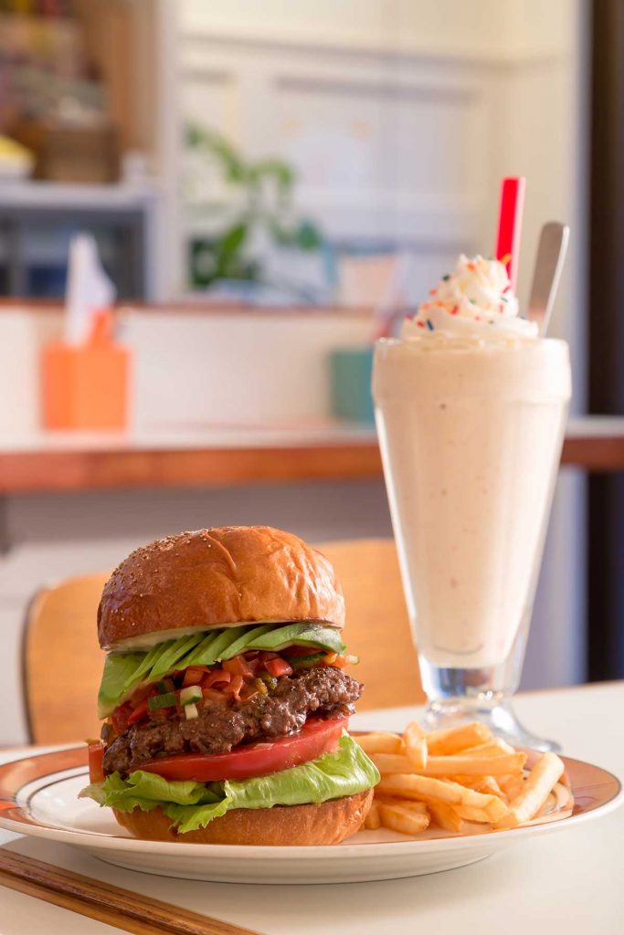 手作りサルサソースとアボカドを挟んだ「MEX BURGER」(1,650円)と「STRAWBERRY SHAKE」(770円)。バーガーは全部で15種類ほど