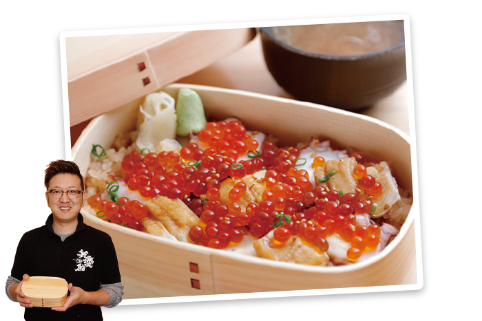 考案者である『弁慶鮨』の菅原 賢(すぐる)さん。いずれは南三陸が誇る杉の木も使いたいとの想いを込めて、『弁慶鮨』では杉のわっぱで提供。「ありそうで無かった、南三陸ならではの組み合わせ。食べた時の驚きを多くの皆さんに味わっていただきたいです」(菅原さん)