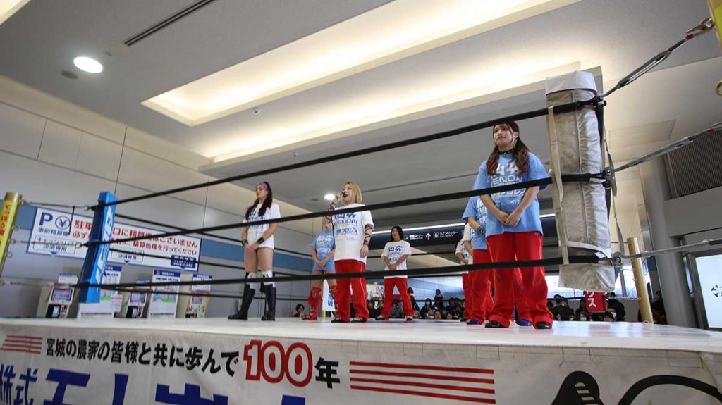 お待ちかねの「センダイガールズプロレスリング」通称「仙女」のみなさんがリングに上がると、会場からは歓声と拍手の嵐!「プロレスは怖いものじゃない、元気をくれるもの。全力で頑張るので、初めて観る人もぜひ楽しんでほしい」と言うDashチサコ選手(写真中央)の言葉で、会場の期待感も高まるばかり!