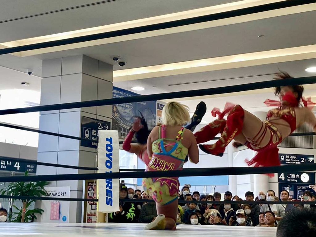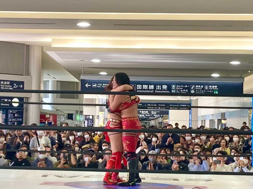 11月24日(日)に開催された「空港プロレス」は、東北から世界へをテーマに、海外旅行ツアーや仙台空港内の「みちのく観光案内」を運営する旅行会社「ツアー・ウェーブ」と、世界で戦う里村明衣子選手率いる「センダイガールズプロレスリング」による特別企画。言葉の壁をとっぱらい、誰もが楽しめる「プロレス」というエンターテインメントを通じて、仙台空港を盛り上げるべく開催されたスペシャルなイベントです。