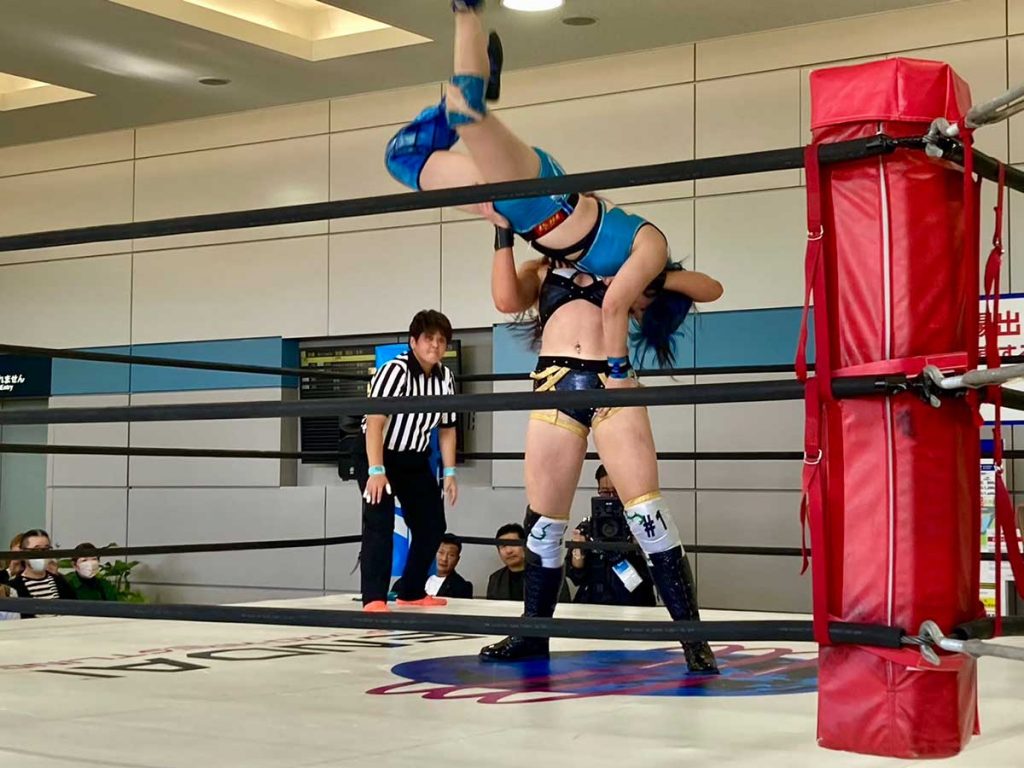 この日は「シングルマッチ」と言われる1対1の試合が2試合、「タッグマッチ」と言われるチーム制による試合が1試合行われました。選手の気合、身体がぶつかり合う音、会場からの声援。ここ空港だっけ?と忘れるほどに、熱気に包まれた会場の一体感に圧倒されました。