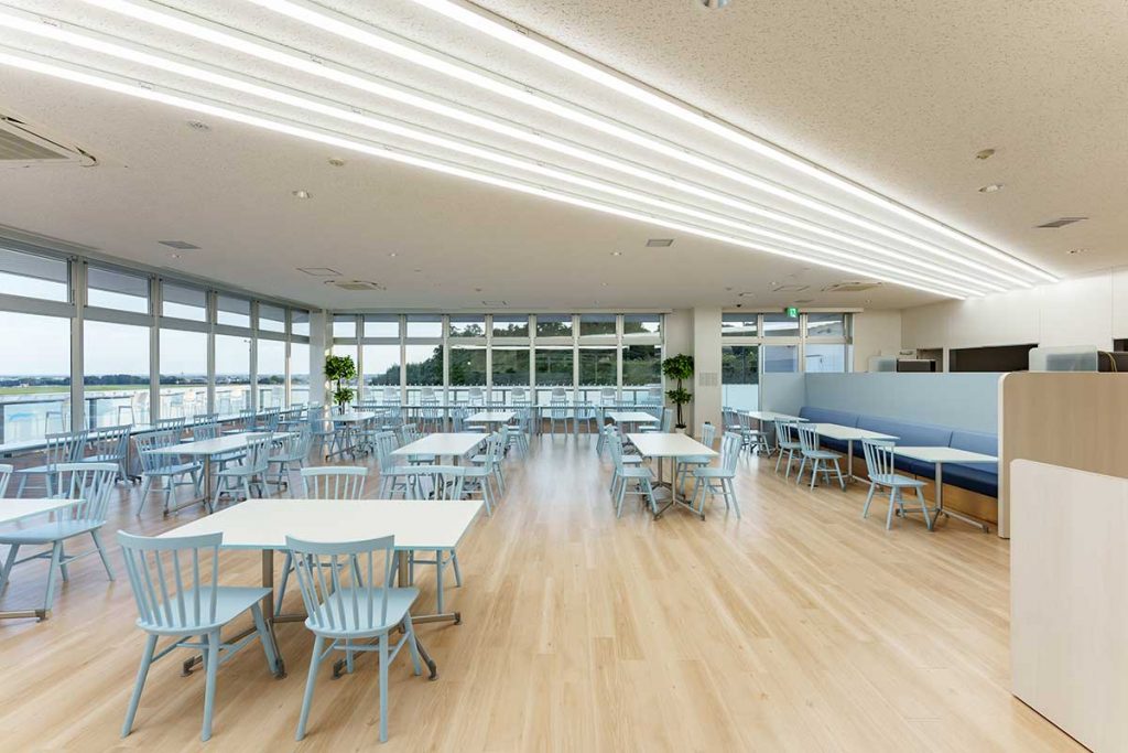 明るくゆったりとした飲食スペース。大きな窓が特徴です