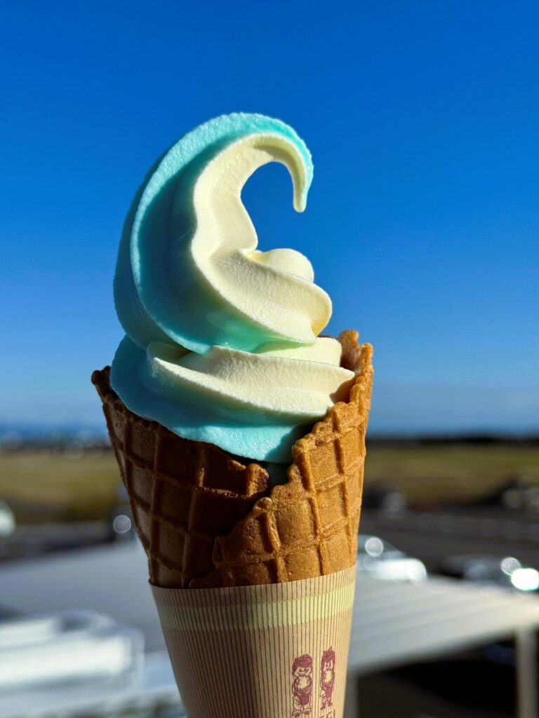 ブルーインパルスをイメージした青色のソフトクリームは写真映え抜群!