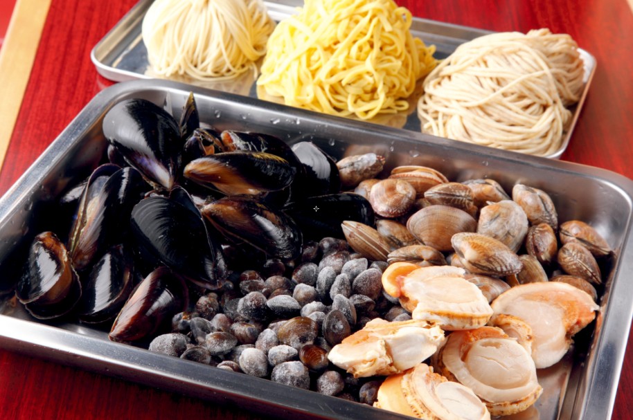 「貝だし塩そば」(850円)※麺の大盛+50円。天然塩ベースのタレに、アサリ、ムール貝、ホタテ、シジミからとったダシを加えたまろやかな一杯。スープが良く絡む、パスタのような平打ちの自家製縮れ麺で、貝の旨みを余すところなく堪能できる