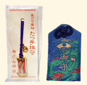 御守…瓶の中に辰子像が収められた「たつ子姫御守」と、龍神が描かれた御座石神社のオリジナル御守