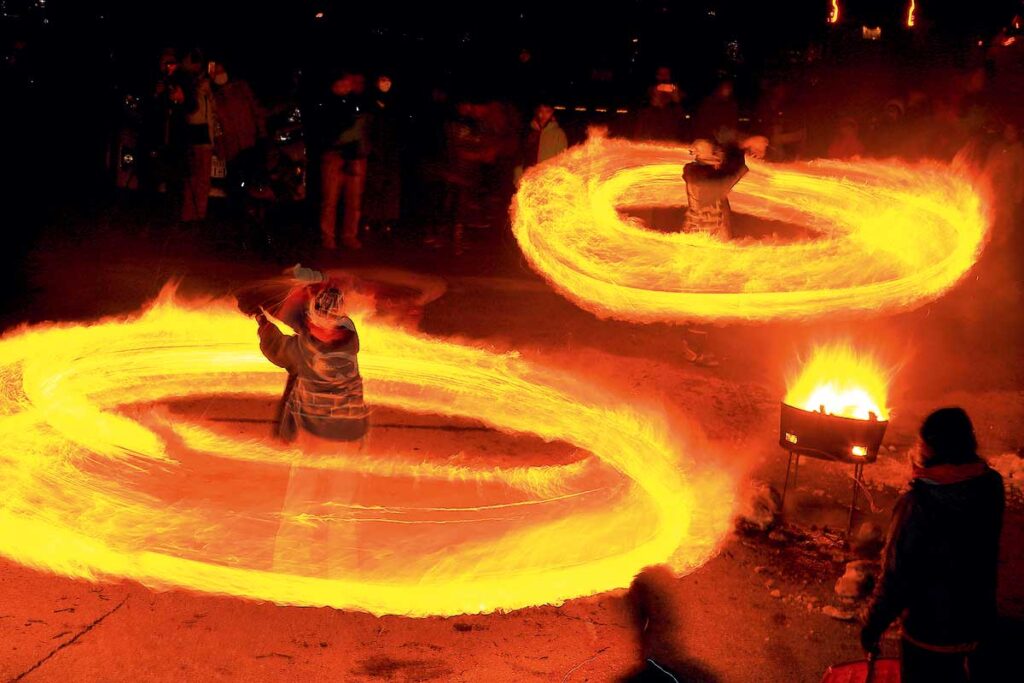 火をつけた炭俵を身体のまわりでぐるぐると振り、無病息災などを祈る小正月行事。雪景色の夜に、数々の光の輪が華麗に躍る様子は圧巻!
