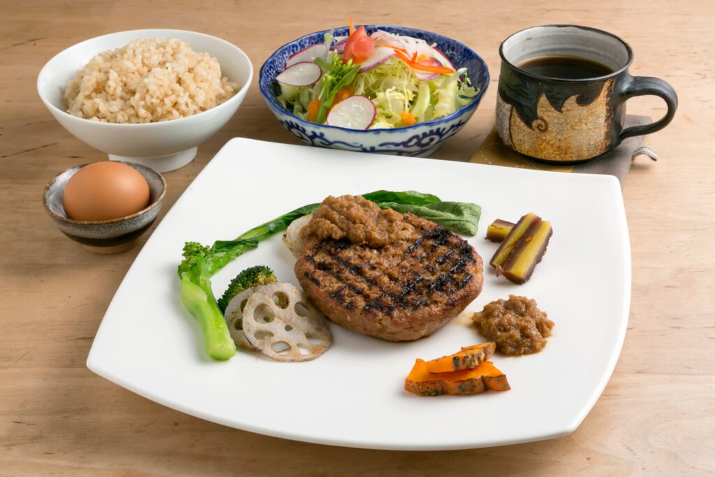 米を飼料に休耕田で放牧された登米の田んぼ豚を使ったハンバーグは、脂の甘みと臭みのない澄んだ旨みが魅力。200gとボリュームもあり、無農薬ササニシキ玄米のプチプチ食感が相性抜群。添えられた平飼いタマゴで、さらに贅沢な味わいが引き立つ。
