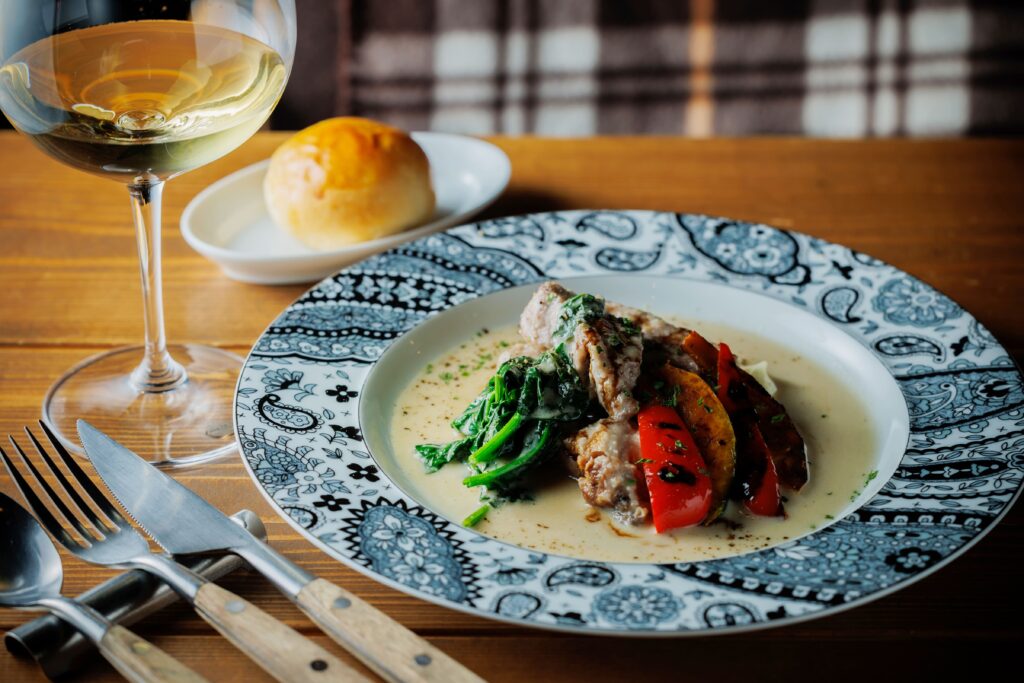 まるで海外の山小屋のような温かみのある店内に癒される登米の人気ビストロ。こちらで提供するのは、登米の名酒「澤乃泉」の酒粕で育てた「ほろよい豚」を使用したポワレ。日本ソムリエ協会認定ソムリエの店主がおすすめするワインと一緒に食事を楽しむのもおす