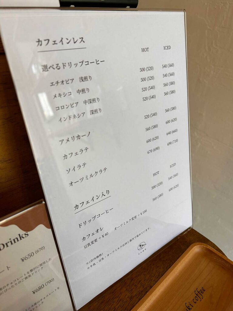 の4種のカフェインレスコーヒーを中心に、カフェラテやソイラテも用意しています。
