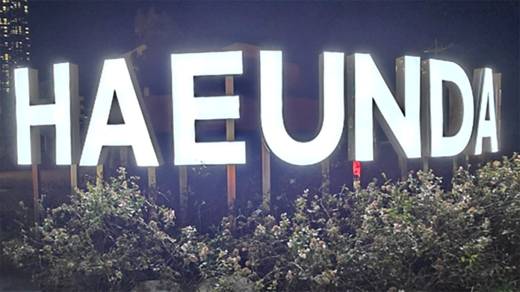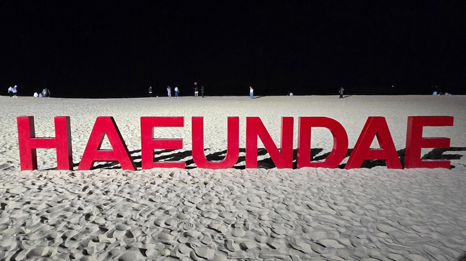 『HAEUNDAE』の文字の前は写真スポットとして大人気💓夜になるとオレンジ色の文字が映えてさらに綺麗です😊