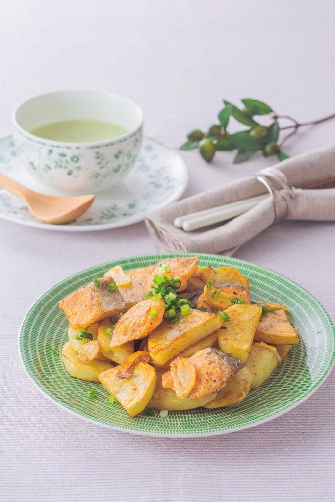 ❶フライパンにバターとにんにくを入れ中火にかけ、バターが溶けたらさけとじゃがいもを加えて両面に焼き色が付くまでしっかり絡める。
