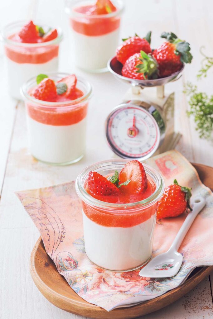 ❷①にヨーグルト・レモン汁を加えざっと混ぜ合わせ、熱いゼラチン液を混ぜたら、手早く器に分け入れ、冷蔵庫で1時間冷やし固める。
