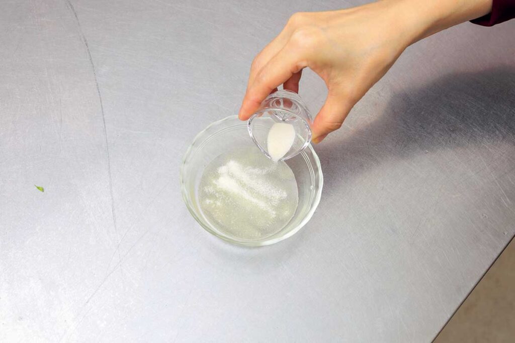 <下ごしらえ>水にゼラチンをふり入れて(※1ゼラチンに水をかけるとダマになってしまうので注意)ふやかし、レンジ600wで15秒程加熱して溶かす。