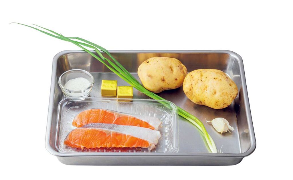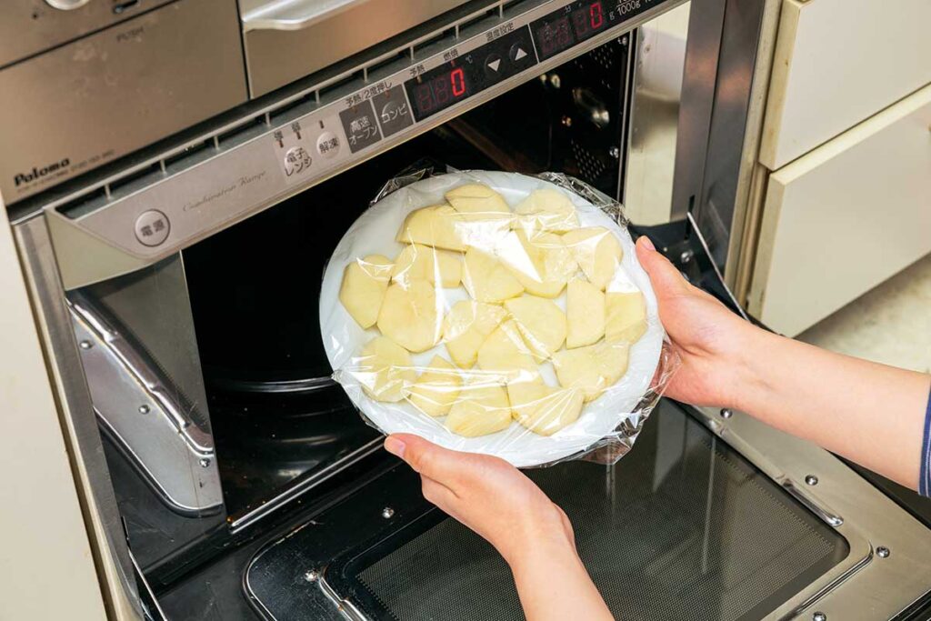 <下ごしらえ>さけは4等分にそぎ切りにして、塩・こしょう・薄力粉をまぶし、にんにくはスライスする。じゃがいもは7~8mmの厚さに切り、耐熱皿に並べラップをして600wで4~5分加熱(※)し、やや硬めに火を通す。