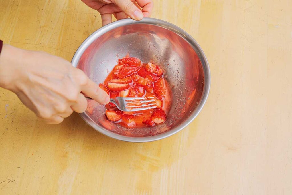 ★③の工程でミキサーがない場合には、ボウルに2~4等分にカットしたイチゴとAを入れておき、水分が出てきたところをフォークの背で潰せば(※2)ソースが完成します!