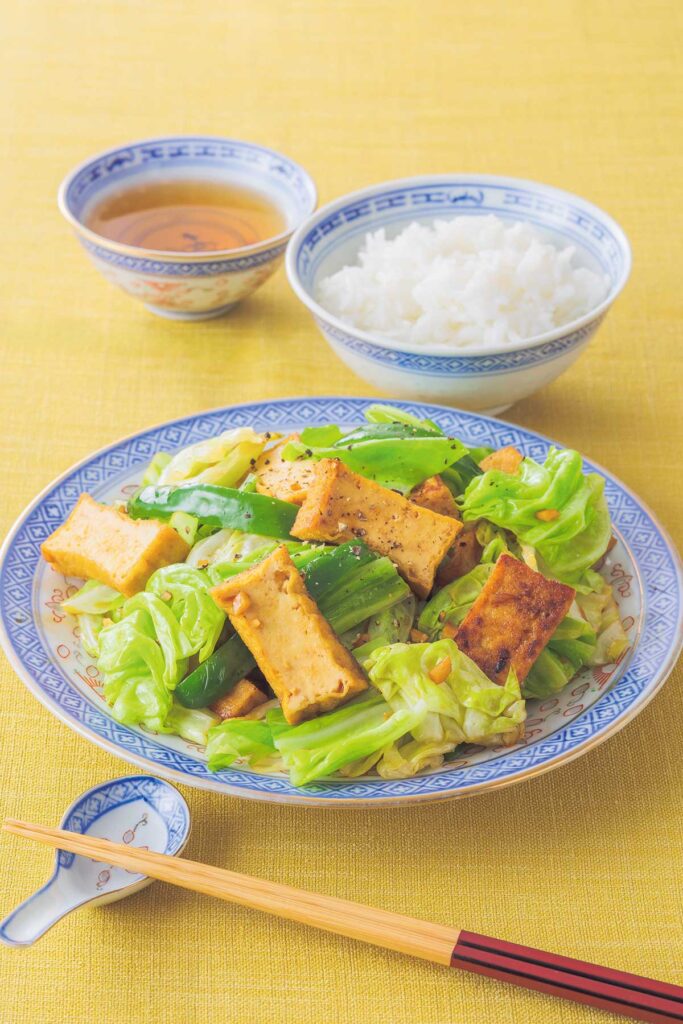 ❶フライパンに油・みじん切りにしたにんにくを入れて炒め、香りが立ってきたら厚あげを入れる。片面に焼き色が付くまで炒めたら、キャベツとピーマンを加えて混ぜながら炒める。