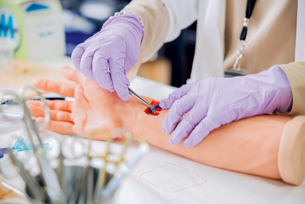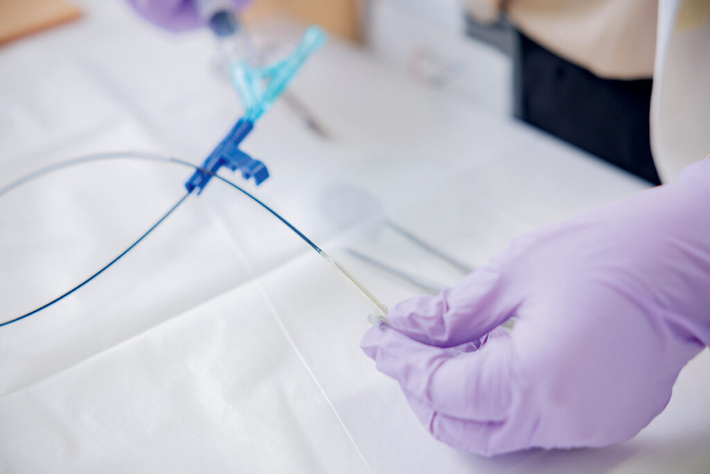 写真は、人体模型を使った試験風景。開発するのは血液透析時に起きるAVシャント(透析用血管)の狭窄(血管内が狭くなること)を防ぐため血流の正常な軌道を確保する埋込医療機器