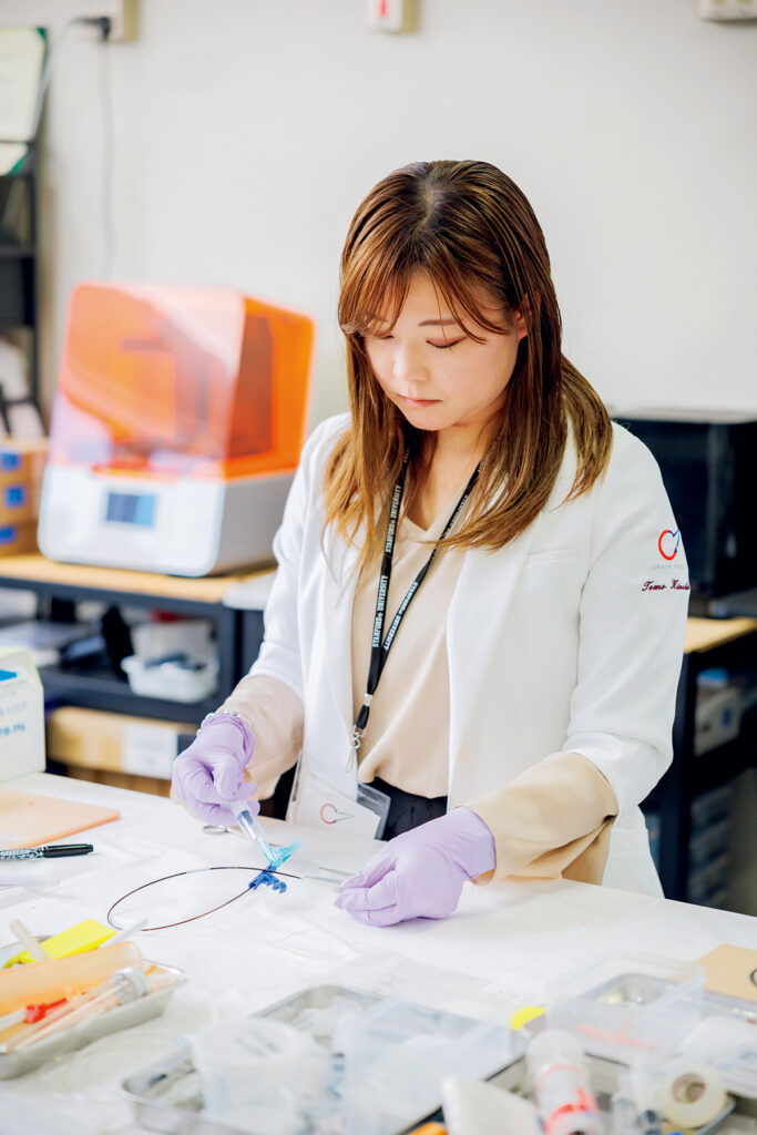 「イノベーションとは、 ニ一ズを的確に捉え、これまでにない新しい考え方・価値を生み出し、社会的に大きな変化を起こすこと。この考えを医療に適用したのがバイオデザインの理念です」。米・スタンフォード大学でバイオデザインに取り組み、その経験を生かして宮城県でべンチャーを立ち上げた梶山愛さん。彼女は今、血液透析時に起こる問題をクリアする画期的なプロダク卜を開発中です。「医療現場で医師や患者さんの困りごとを分析して解決へと導くのが私の大きな役割です。ひとつの製品の開発に集中できるのがベンチャーの良さ。これがいずれ多くの人の助けになる、そんな想いでプロジェクトに取り組んでいます」。