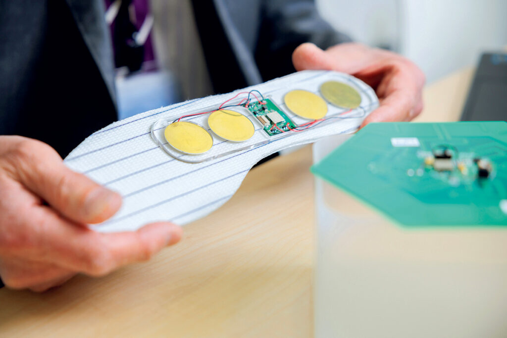 開発中のスマートインソールは歩くことで発電する特種な全属パ一ツを使用しており、充電がいらないのが画期的
