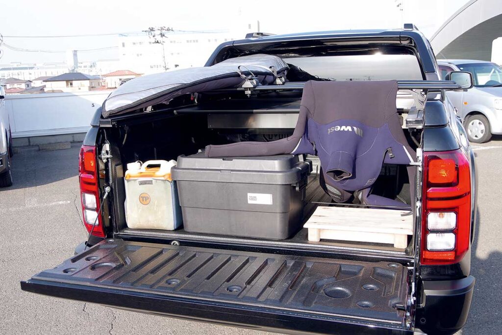 購入の決め手は迫力満点のルックス。「アメ車のような迫力あるルックスにひと目惚れしたのはもちろん、大きな荷台に荷物がたくさん積めるところも決め手でした。1年を通してサーフィンをしているのと、家族と一緒にキャンプに出かけることも多いですが、大きな荷物をたくさん載せても『トライトン』の荷台なら余裕たっぷりです」。