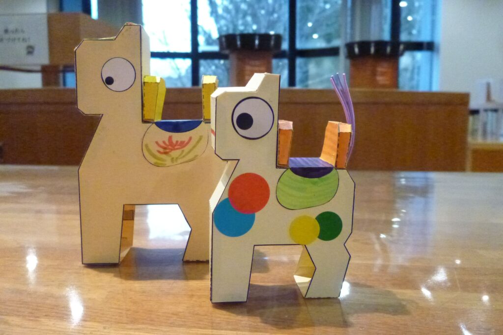 型紙を組み立てたり、絵付けをしたりして、木下駒をイメージしたペーパークラフトづくりが体験できます。