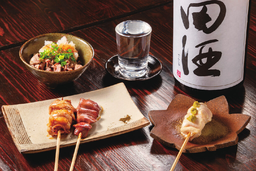 ・焼鳥3種(伊達鶏のモモ肉、ササミワサビ、本日の内蔵串)、日替り小鉢1品