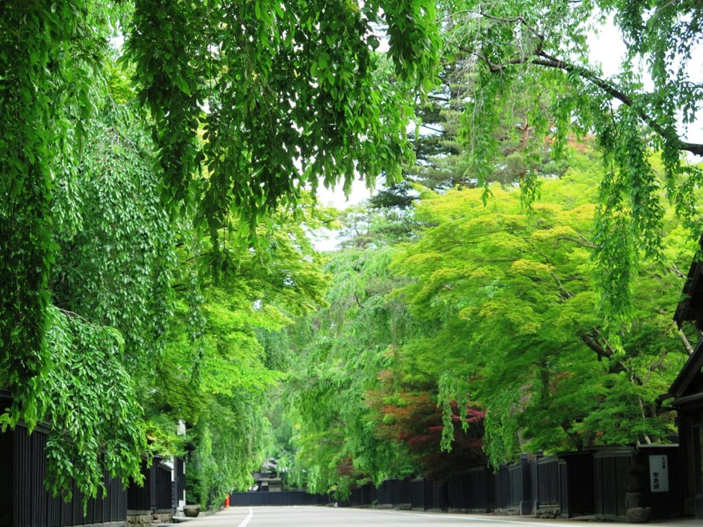 降りそそぐような新緑の緑と黒板塀とのコントラストに心奪われる武家屋敷通りは、フォトスポットとしても人気