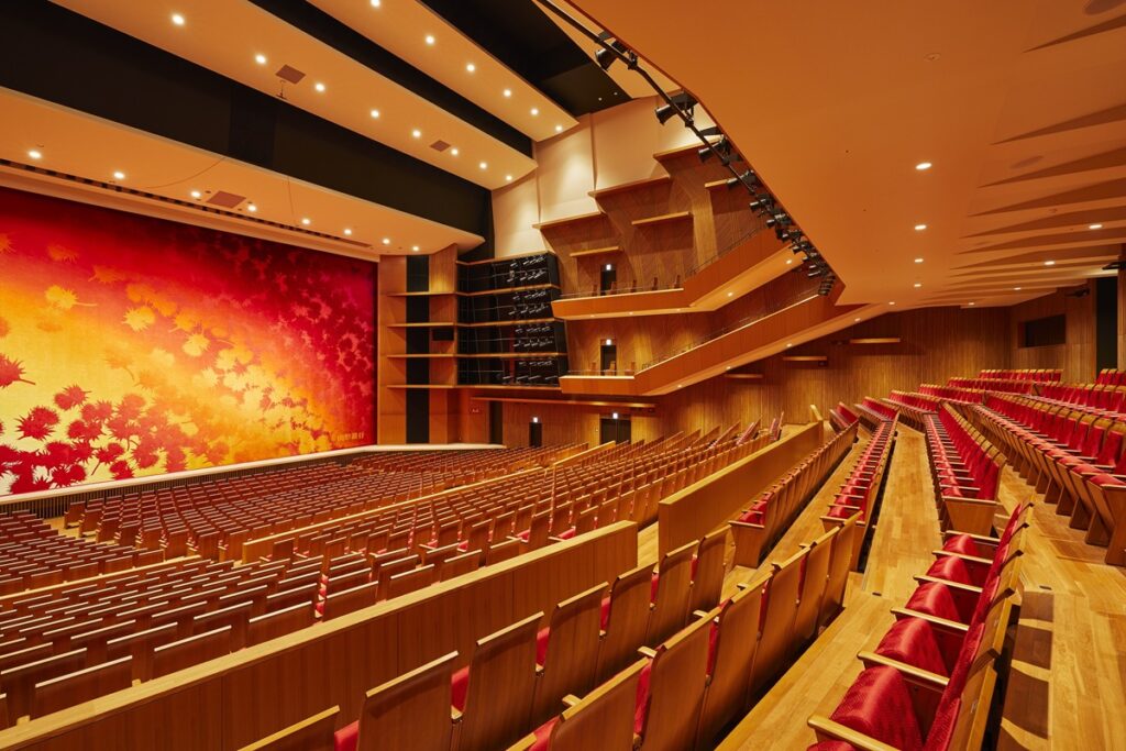東北地方屈指の収容人数を誇る2,001席の大ホール。山形を象徴する「紅花」と「自然」をモチーフにした緞帳、米沢織の技法を用いた生地に「庄内刺し子」の文様を織り込んだ客席座面など、山形の伝統と技術がふんだんに取り入れられています