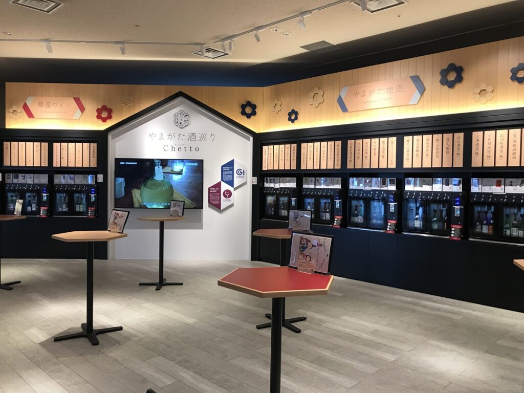 『やまぎん県民ホール』から徒歩3分、JR山形駅直結の『霞城セントラル』1階に新スポットが誕生。山形県産日本酒・ワインの有料試飲ができる『やまがた酒巡り Chetto(ちぇっと)』では、常時42種類揃う酒類から、3種類の試飲を500円で楽しめます。県産品のおつまみ自動販売機も要チェック!