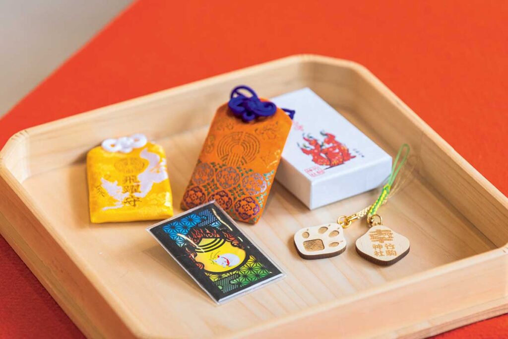 ”おきつねさま”の足跡モチーフや、細かい造形が目を引く切り絵仕様のものなど多彩なデザインのお守り