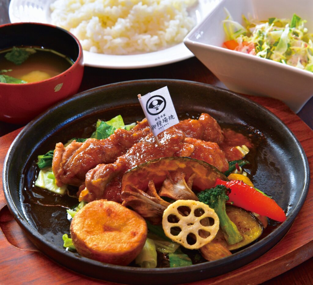 角館の郷土料理「御狩場焼」は、肉や季節の野菜などを山椒味噌で料理したもの。香ばしい味噌の香りが食欲を掻き立てます