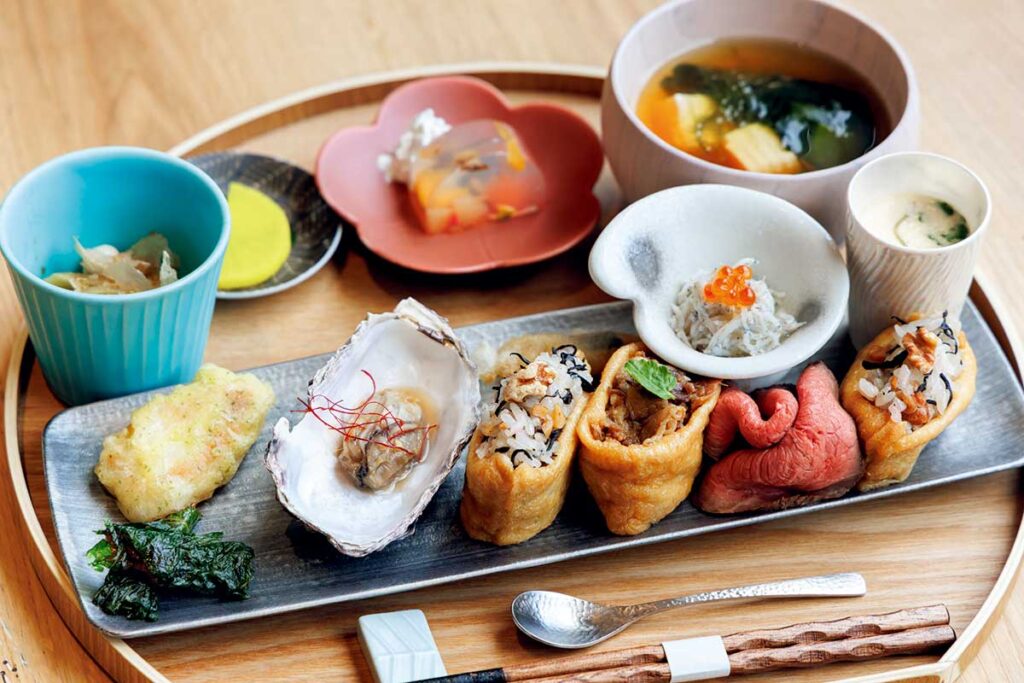 「竹駒稲荷お参り御膳」(1,980円)。カキや牛しぐれなど仙台の味覚がたっぷり。店内ではパフェやクリームソーダなども提供しています