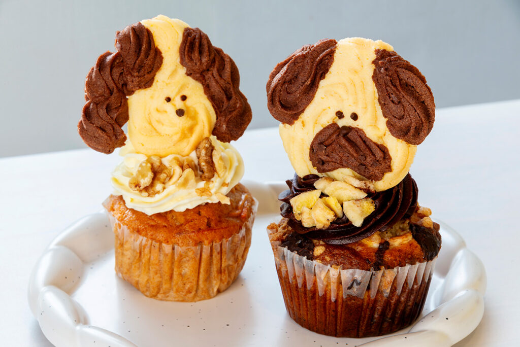自家製キャロットケーキや、季節のマフィンには、犬型クッキーを6種類から選んでトッピングできる遊び心も。