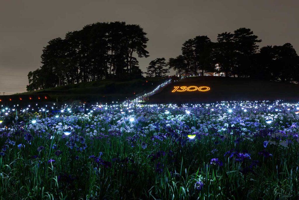 『光のインスタレーション多賀城2025』では、夜空の下でアヤメと光がやさしく交差し、日中とはまた違った静けさと美しさを感じられる空間が広がります。