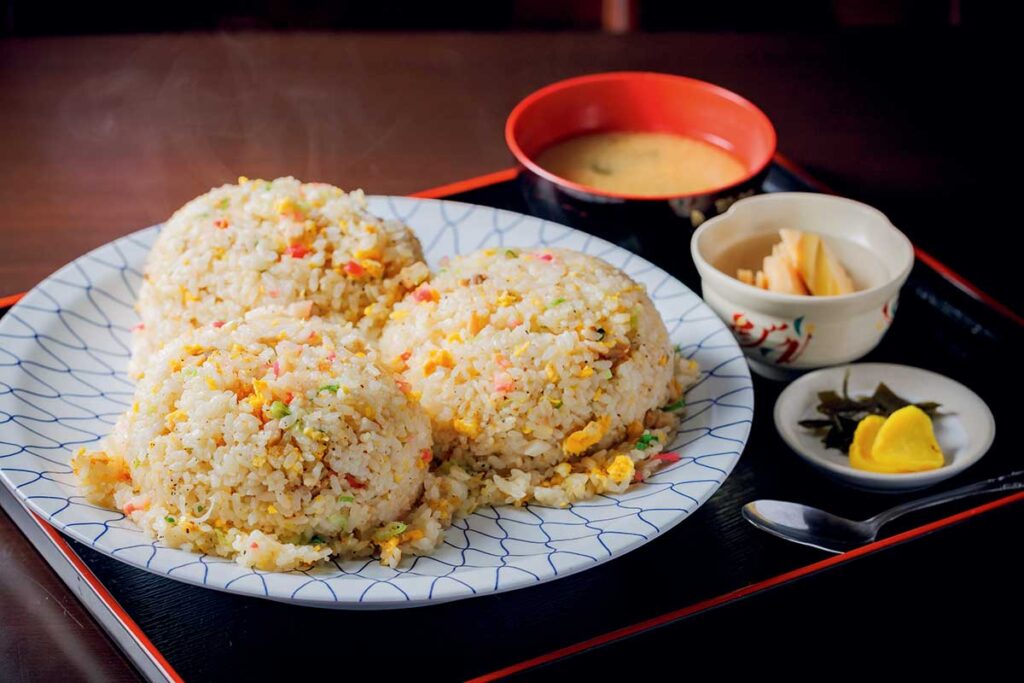 お椀を使い、ぎゅっと押し込んで作るチャーハンのひと山。ゴマ油の香りが食欲をそそります