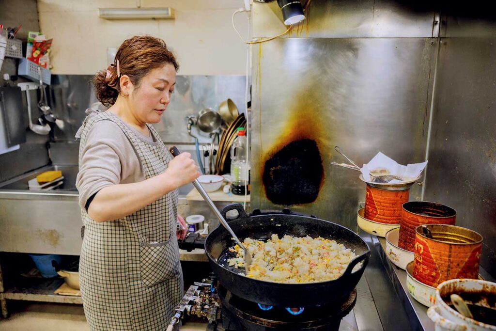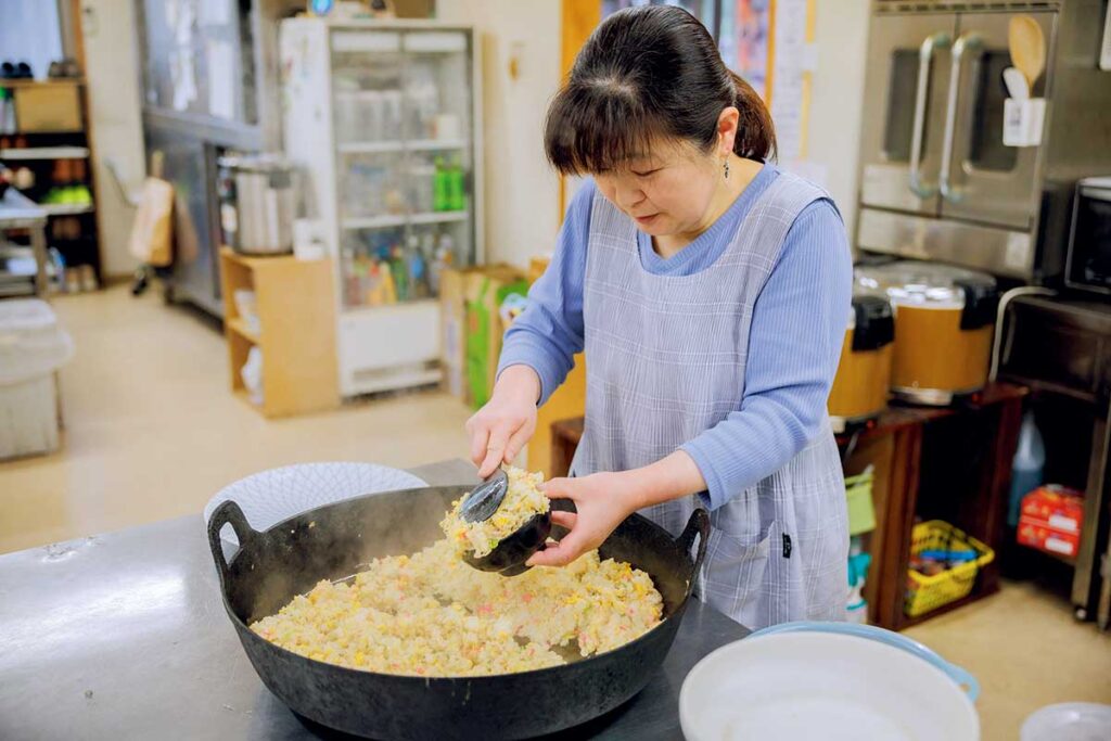 約一升分のご飯を使ったチャーハンを調理。ほかの定食屋メニューなどもてきぱきと準備