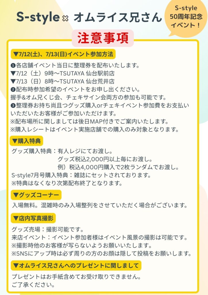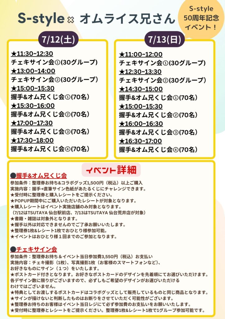 『TSUTAYA仙台駅前店』と『TSUTAYA仙台荒井店』にて、「握手&オム兄くじ会」、「チェキサイン会の」2種類のイベントを両日とも実施します。※会場は日によって異なります