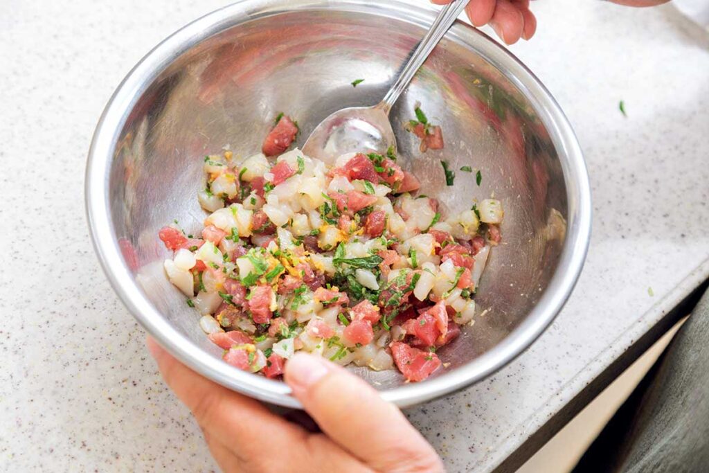 ❶かつおとほたては5ミリ角に切る。大葉、細ねぎはみじん切りにする。