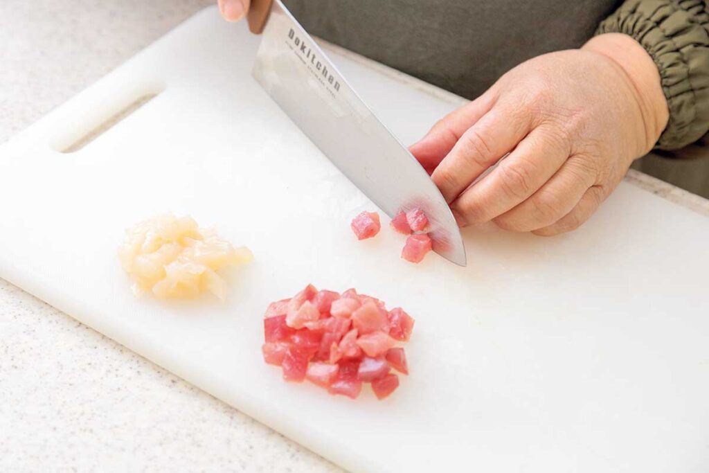 かつおとほたてを切る時は、角切りにすることで食感も楽しめるなめろう丼になります