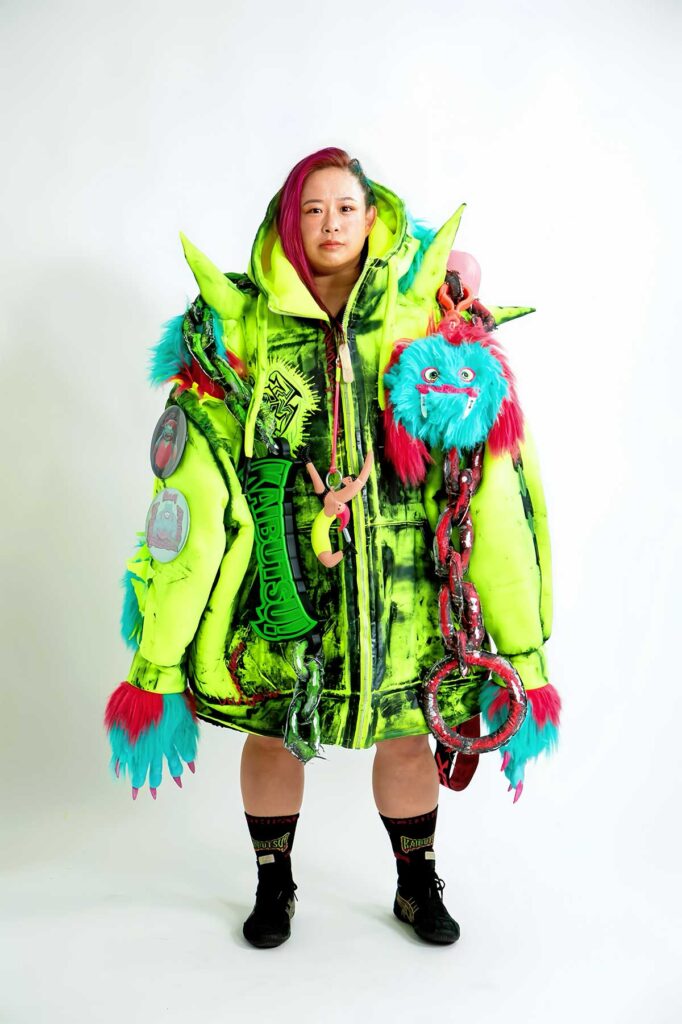 へえ、怪物の産みの親はデザイナーさんだったんですね!このガウンもカラフルで本当に目をひきます。”プロレス赤ちゃんファン”として、すごく素朴な疑問なんですけど、ガウンとかコスチュームって、選手ご自身で色やイメージを伝えて作るんですか?