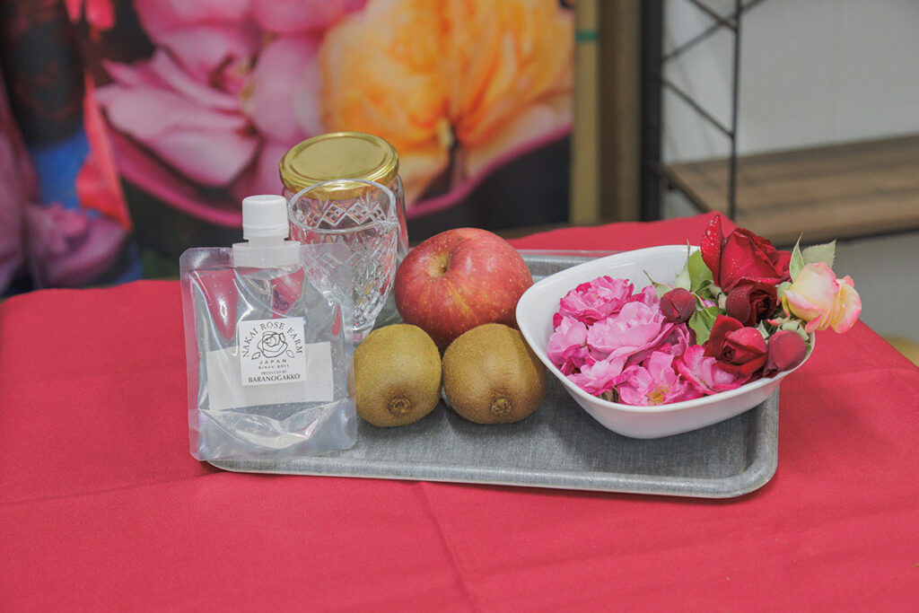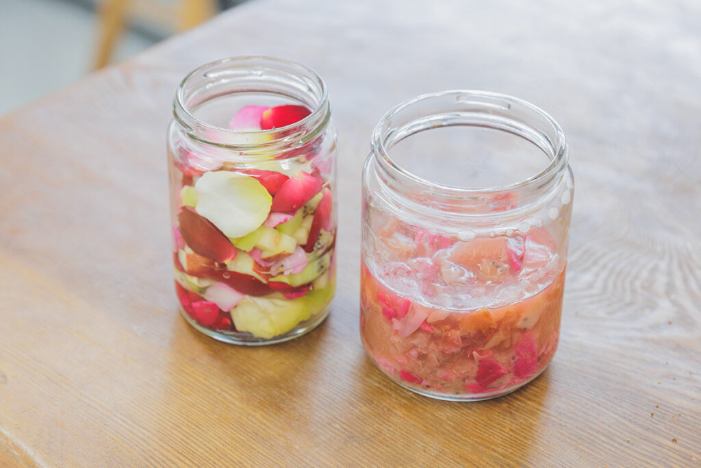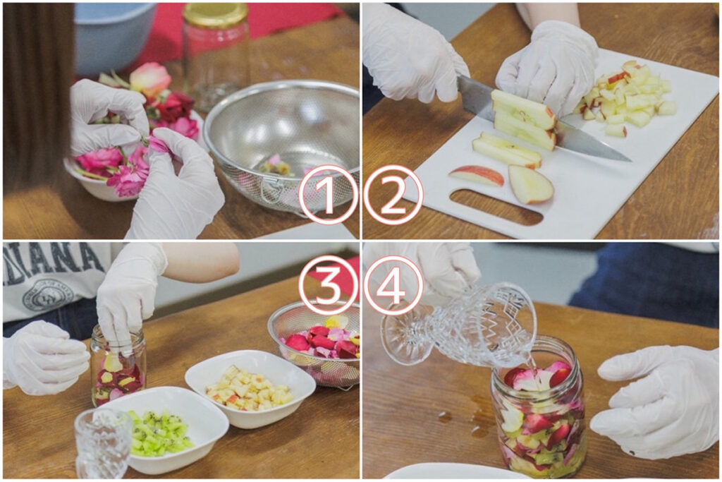 酵素作りの材料は、リンゴ、キウイフルーツ、食用バラ、食用バラの香りや成分を抽出したローズウォーター。食用バラは香りの違う数種類を使用します
