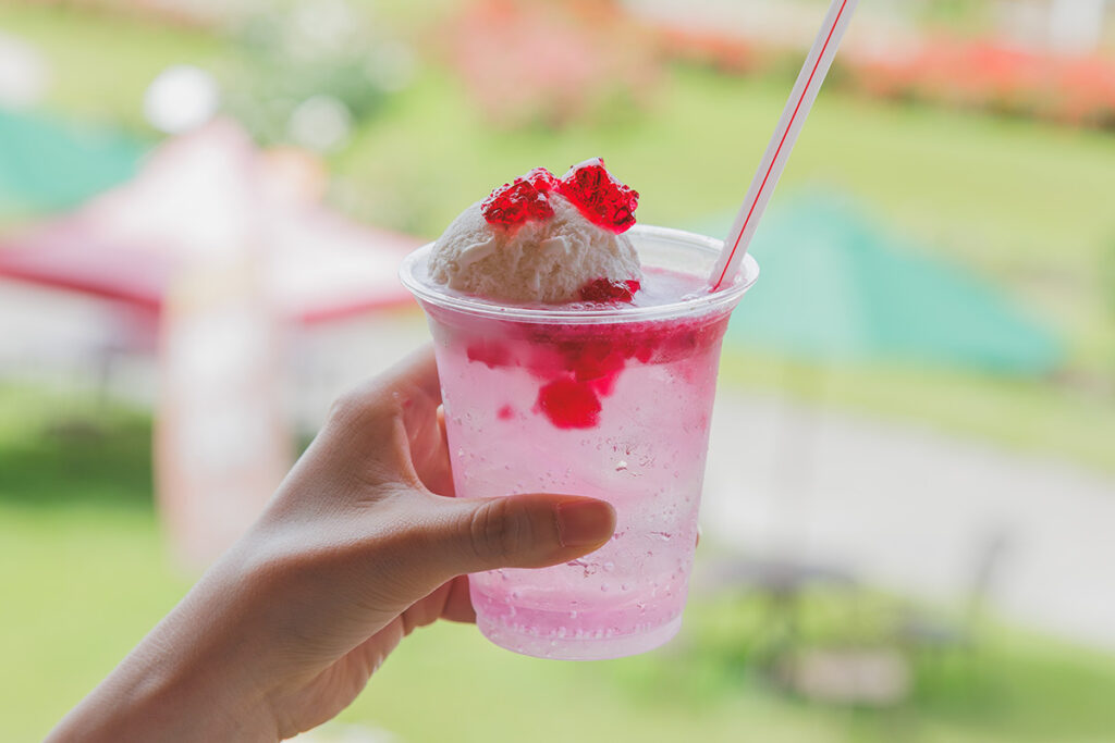 「バラフロート」600円。バラのゼリーとアイス、サイダーを組み合わせたバラ尽くしのフロート