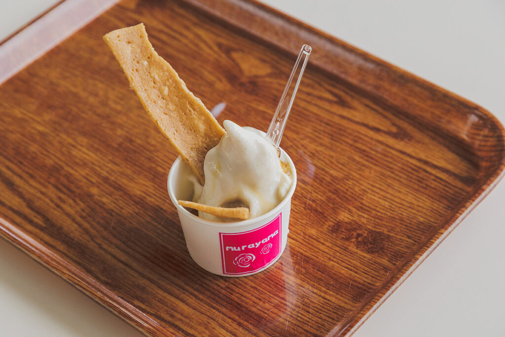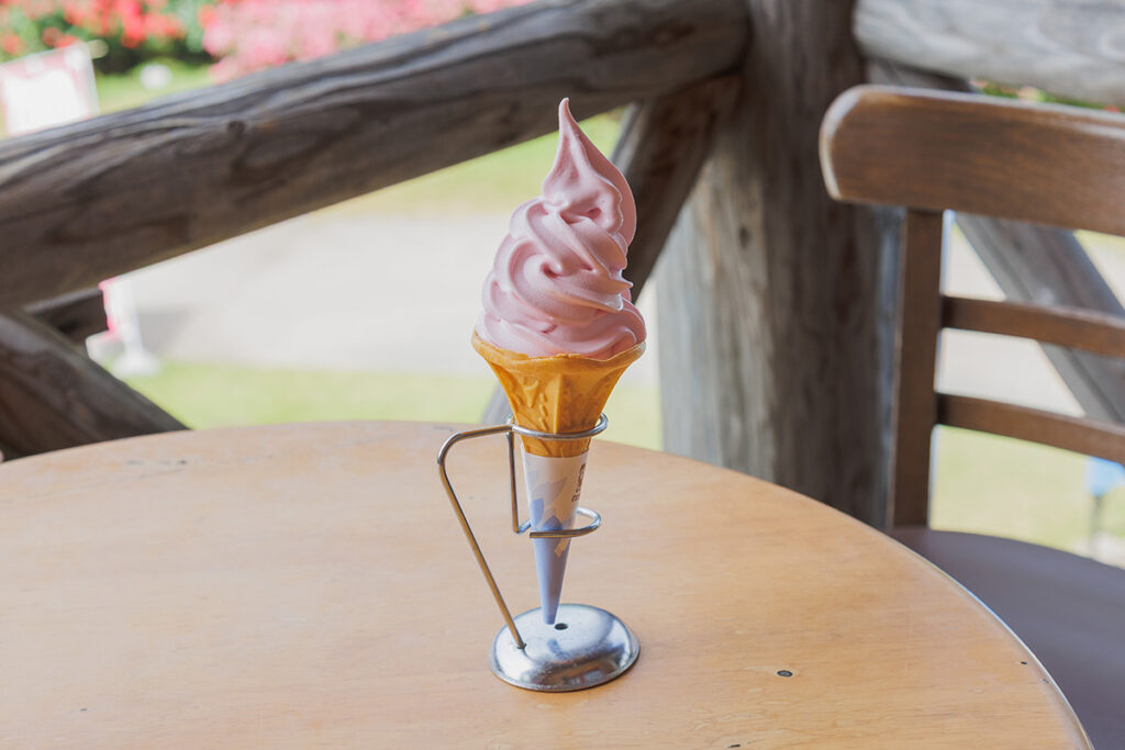 「バラソフト」500円。バラの香りがふわっと香る、バラ公園オリジナルのソフトクリーム
