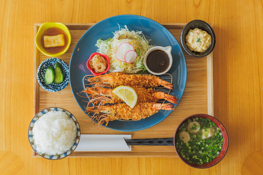 巨大なエビフライは、衣はサクサク、中のエビはふっくらぷりぷりで、インパクトもボリュームも満点の一品です!