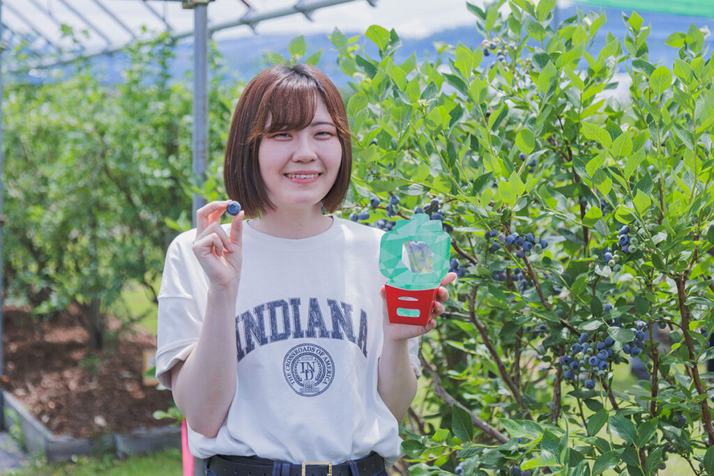 17品種300本のブルーベリーの木が植えられており、6月下旬~8月中旬にかけてブルーベリーの収穫体験を楽しむことができます。村山市でブルーベリー収穫体験ができるのはここだけ!